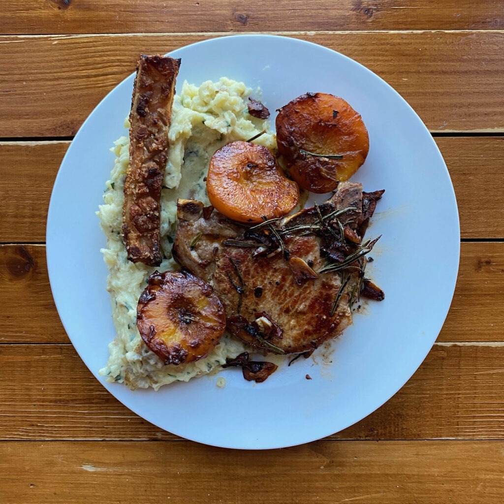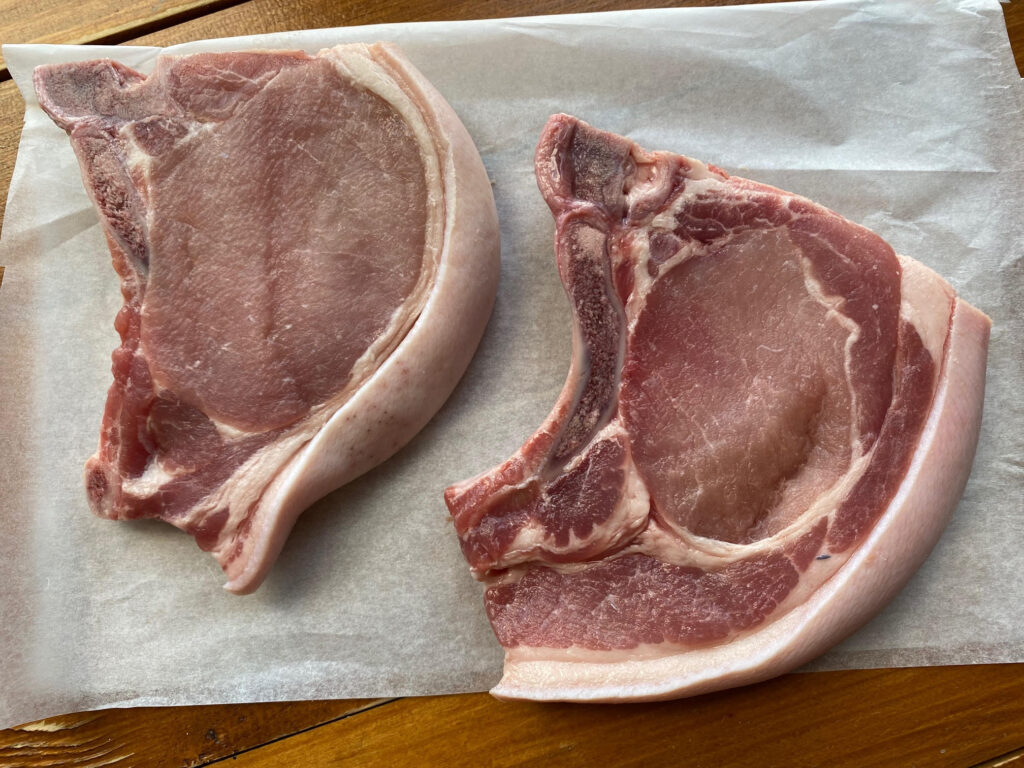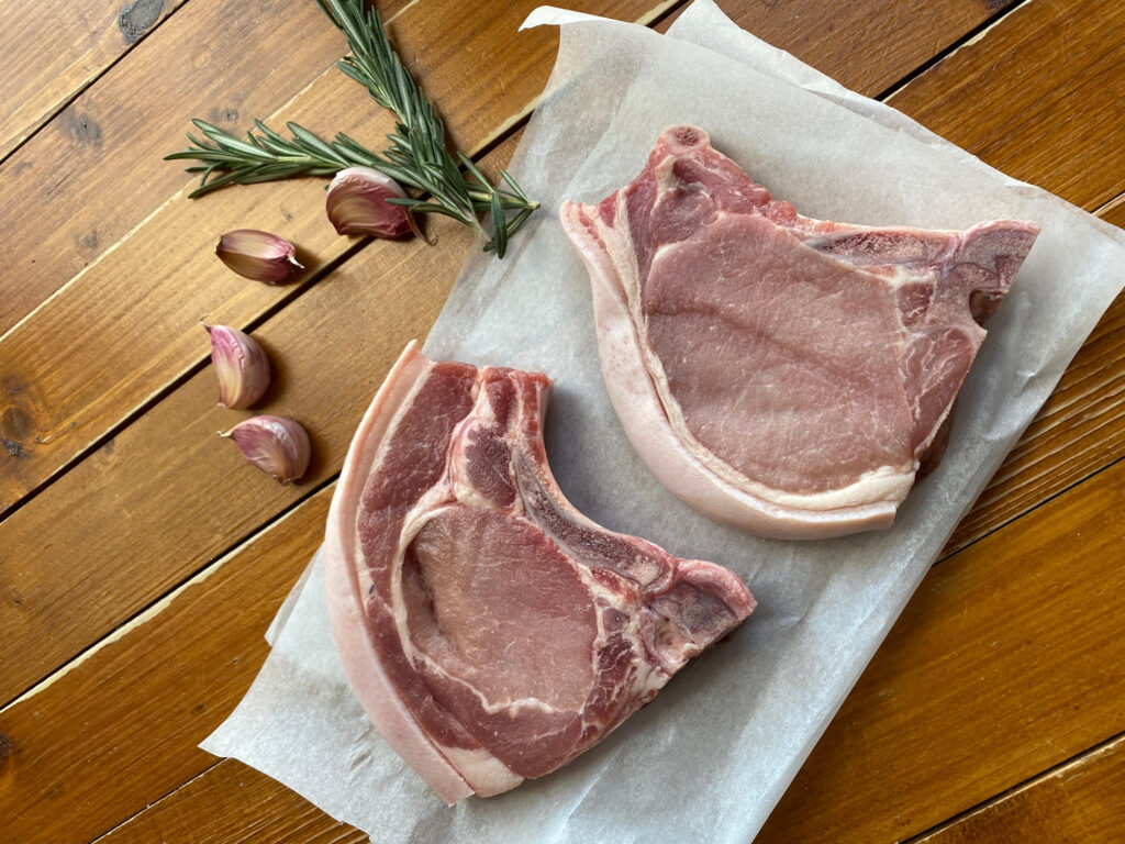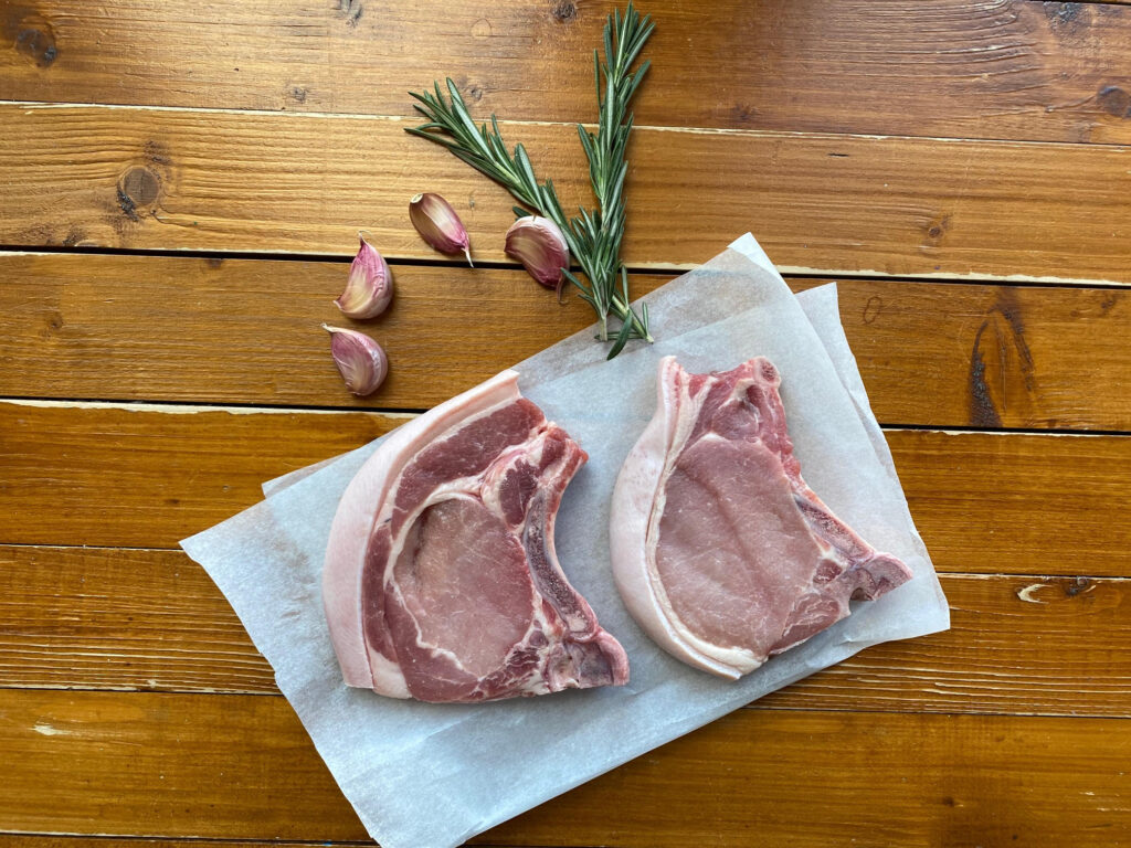 - 2 x 250 g higher-welfare UNCLE BEEF pork chops , with rind