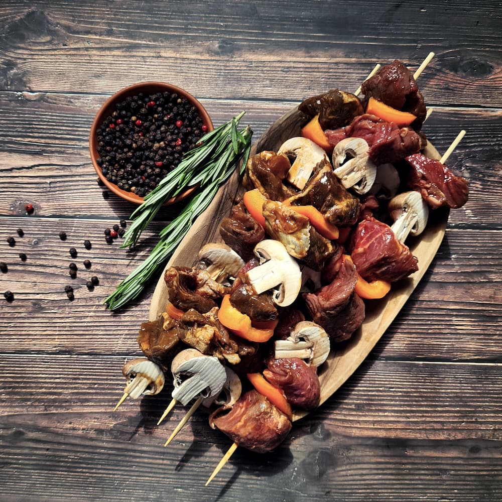 Known as “Sosaties” in South Africa. These are cubes of rump marinated in a secret curried,chutney bbq sauce.