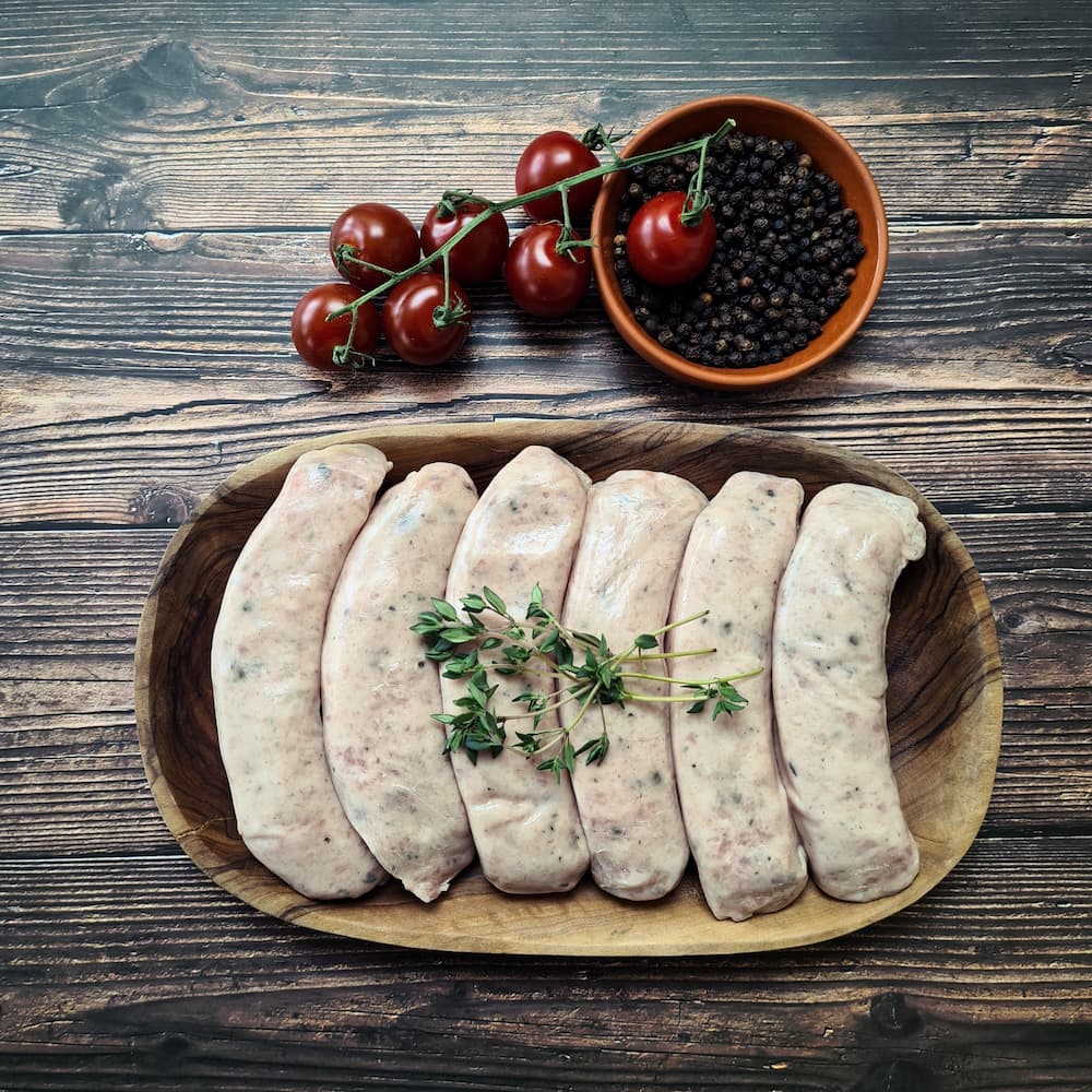Raw fresh pork with herbs in natural hog casing made with Free Range Pork. A great breakfast sausage or perfect for bangers and mash! Each sausage weighs approximately 80 grams.