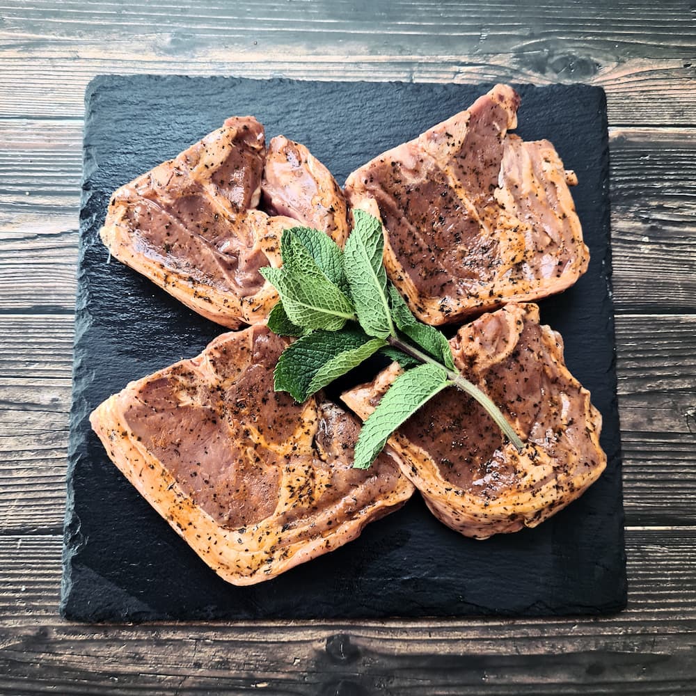 A delicate taste of fresh mint, combined with sweeteners and acidity, plus an attractive visual herb appearance.The Juices from the meat will be drawn out by the dry glaze making your chosen meat extra tasty with a sauce like appearance. Our lamb is English and Grass-fed. Allow atleast 2 chops per preson