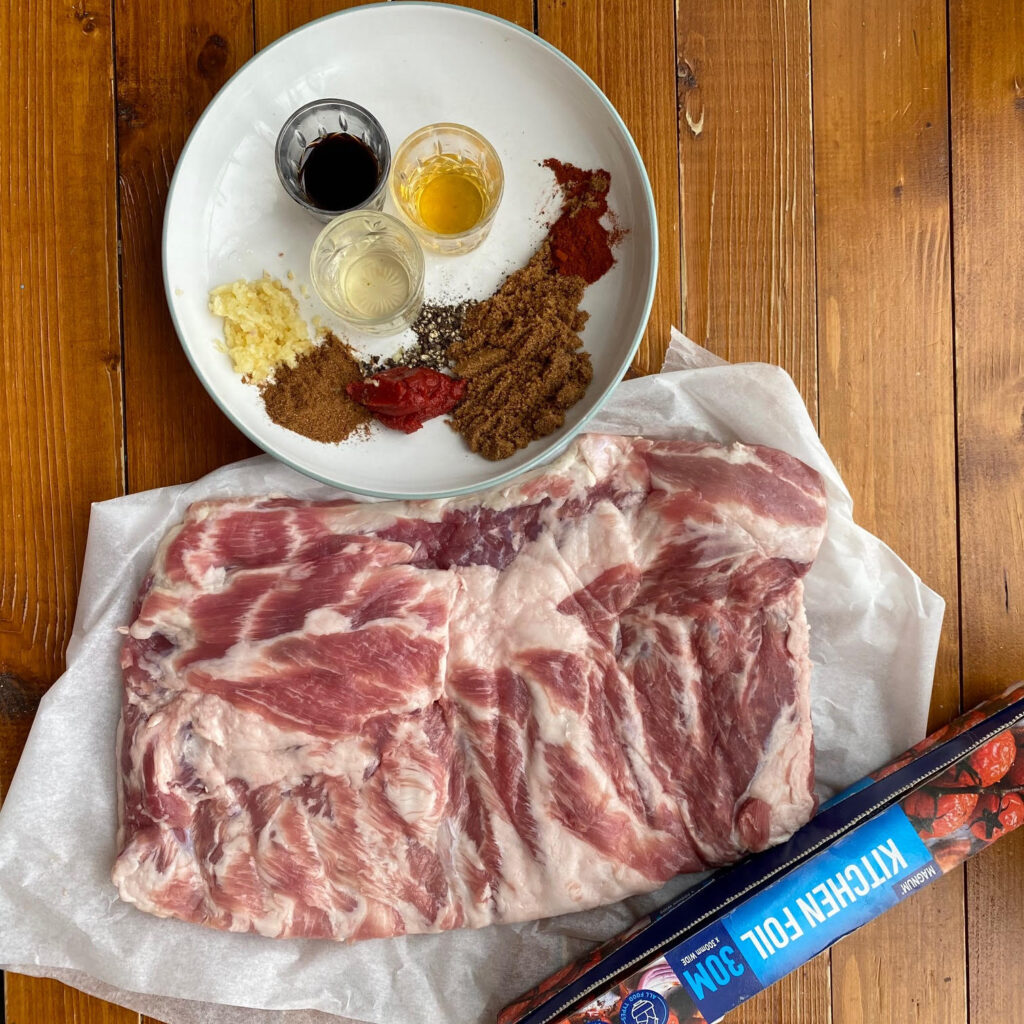 Preheat oven to 160°C and bake the ribs in the oven for 2 hours with the tin foil still on.