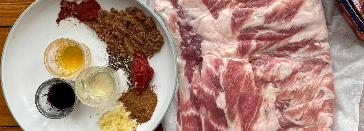 Place your rack of ribs in a baking tray. Pour 1/2 of the marinade over them and rub it in. Cover with tin foil and marinate for 2 hours in the fridge.